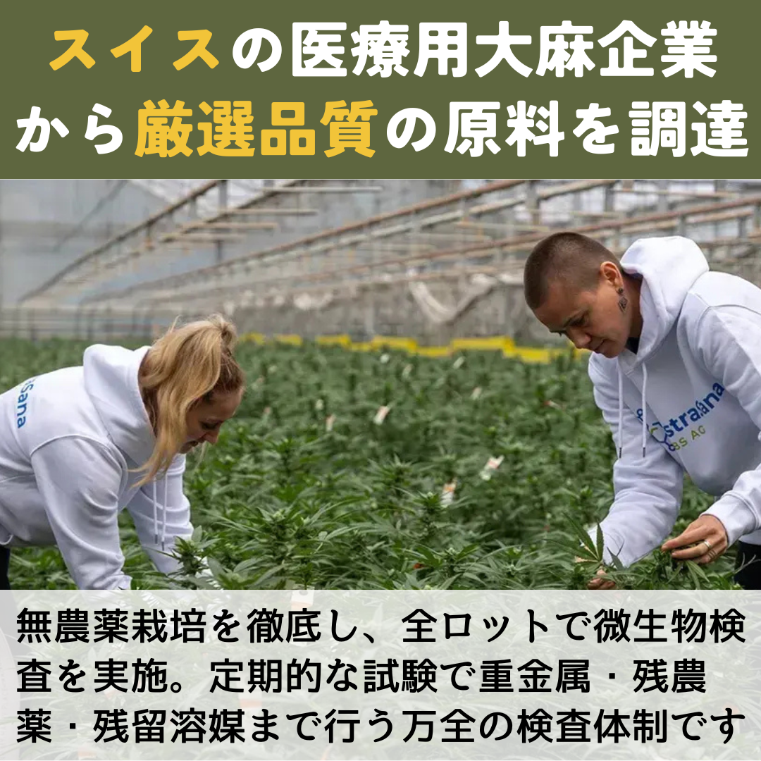 We have now mobilized the information and network we have gained through interviews with CBD shops and brands, as well as visits to various manufacturing facilities (factories and farms) and trade shows, to create an original, top-quality product made from carefully selected ingredients, which we are now pleased to present to you.